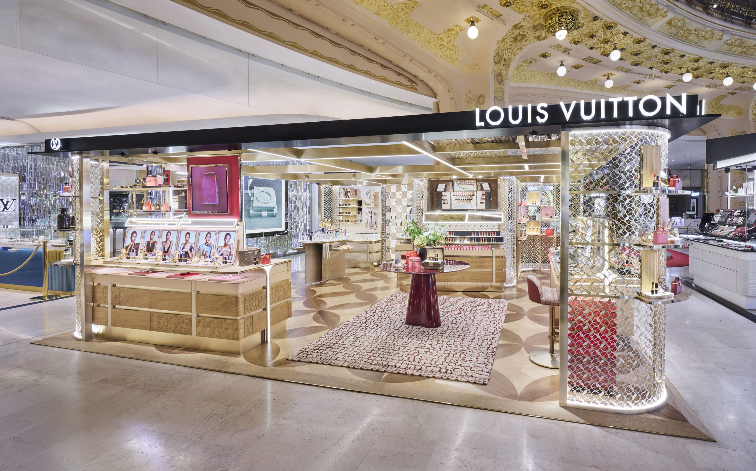 Pour son deuxième projet confié aux Galeries Lafayette Haussmann, la Maison Louis Vuitton nous a sollicitées pour accompagner l’ouverture de son premier corner Beauty, situé au rez-de-chaussée de ce grand magasin. Nous avons assuré la conception technique et la coordination de leur réalisation pour le réaménagement retail complet, en veillant à respecter l’identité de marque et l’expérience client luxe. Ce corner s’inscrit dans un écrin résolument haut de gamme : une structure métallique ajourée haut de gamme reprenant le motif diamant emblématique de la Maison, dialogue avec des matières nobles – bois, cuir tressé et métal champagne – pour créer une atmosphère élégante et sophistiquée. Les enjeux du projet étaient multiples : développement technique d’un concept retail innovant, recollement et synthèse des plans des entreprises, coordination des travaux de nuit, suivi rigoureux des délais dans un contexte logistique exigeant, et livraison parfaitement millimétrée dans les temps.